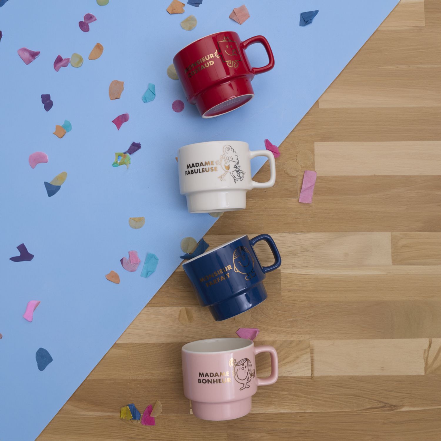 Réveillez votre routine matinale avec le Coffret 4 Tasses Empilables Mr Mme. Chaque tasse de ce quatuor charmant porte un visage souriant, promettant de disperser les nuages matinaux avant même la première gorgée de café. Conçues pour s'empiler avec élégance, elles économisent non seulement de l'espace, mais ajoutent aussi un brin de malice à votre cuisine.