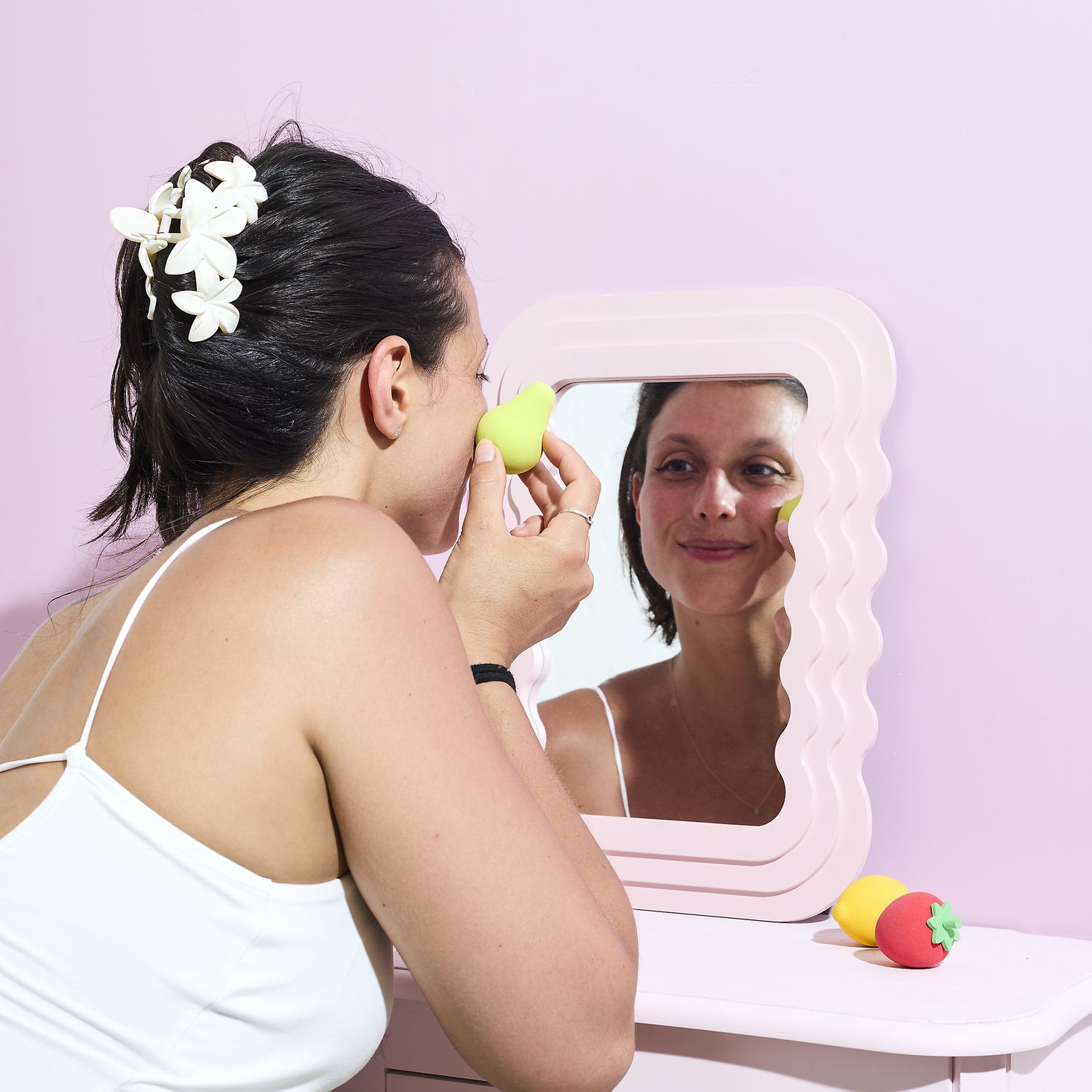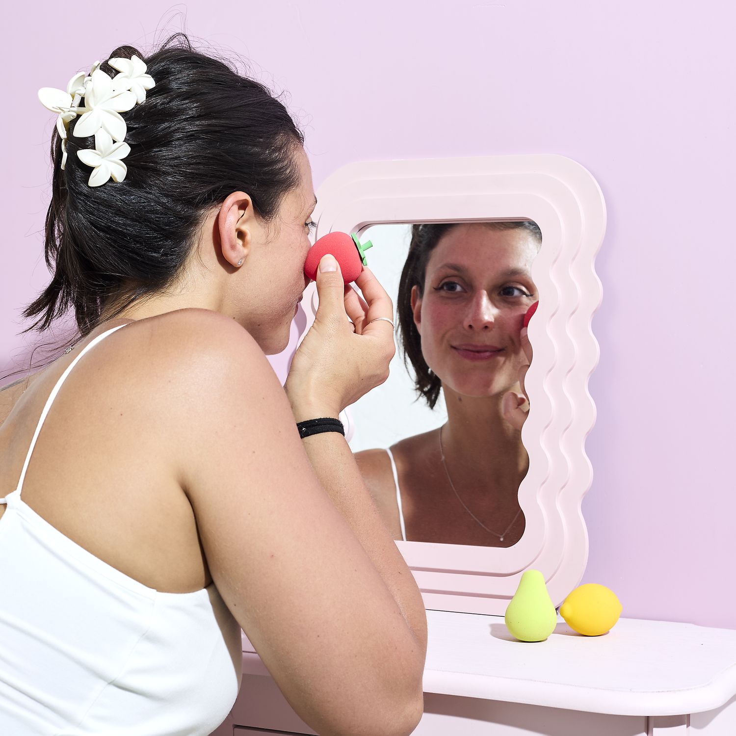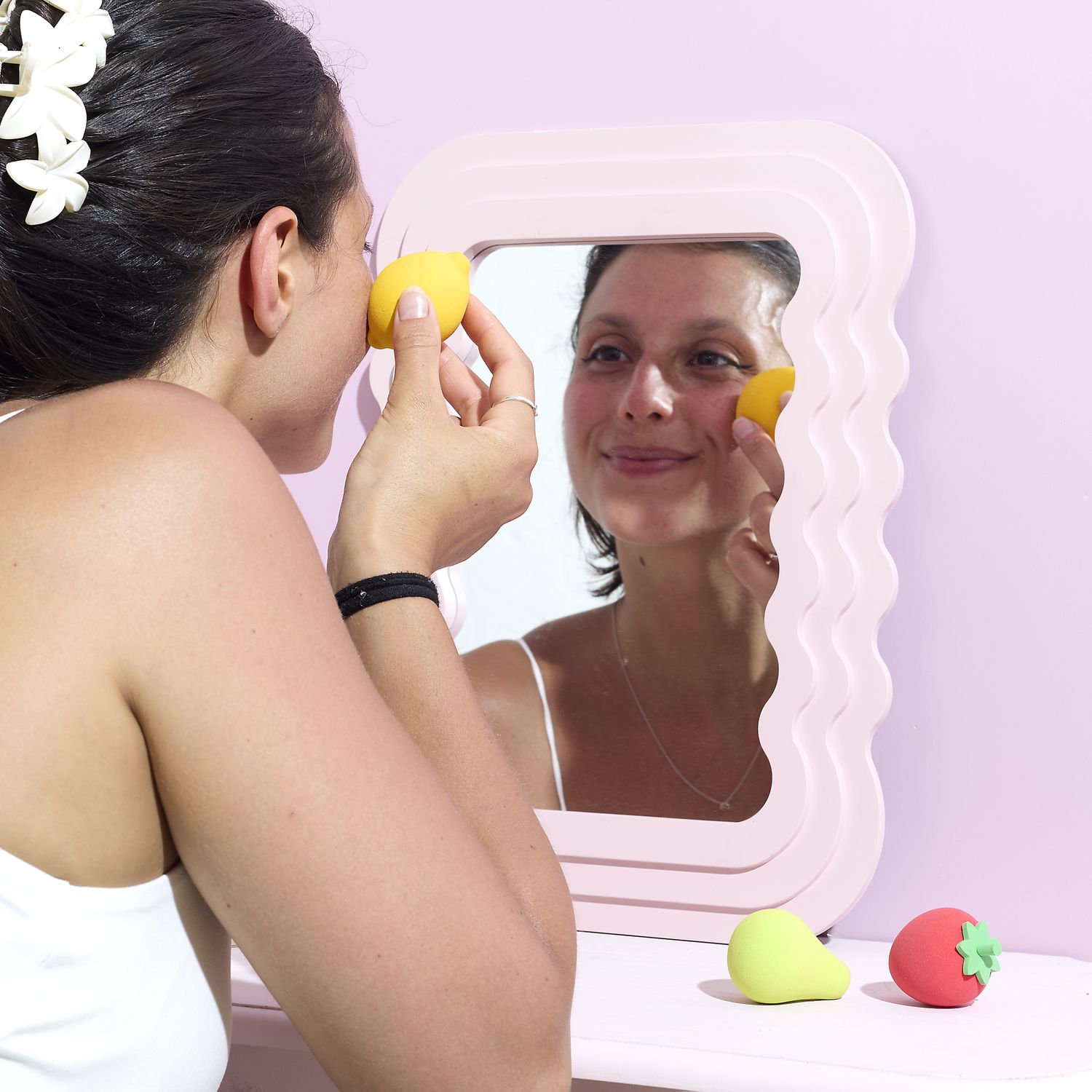 Ce qui fait le charme du Coffret Fruits Coquettes, c’est évidemment son design unique. Des petites éponges qui ressemblent à des fruits ? Impossible de ne pas craquer ! Leurs couleurs vives et leur allure gourmande en font de véritables objets déco pour la salle de bain ou la coiffeuse. Posées sur une étagère, elles apportent immédiatement une touche de pep’s et de fraîcheur à l’espace. Mais attention : même si elles ressemblent à des bonbons acidulés, elles ne sont pas comestibles. Leur mission est ailleurs : vous offrir un maquillage impeccable et un rituel beauté qui donne envie de sourire à chaque utilisation.