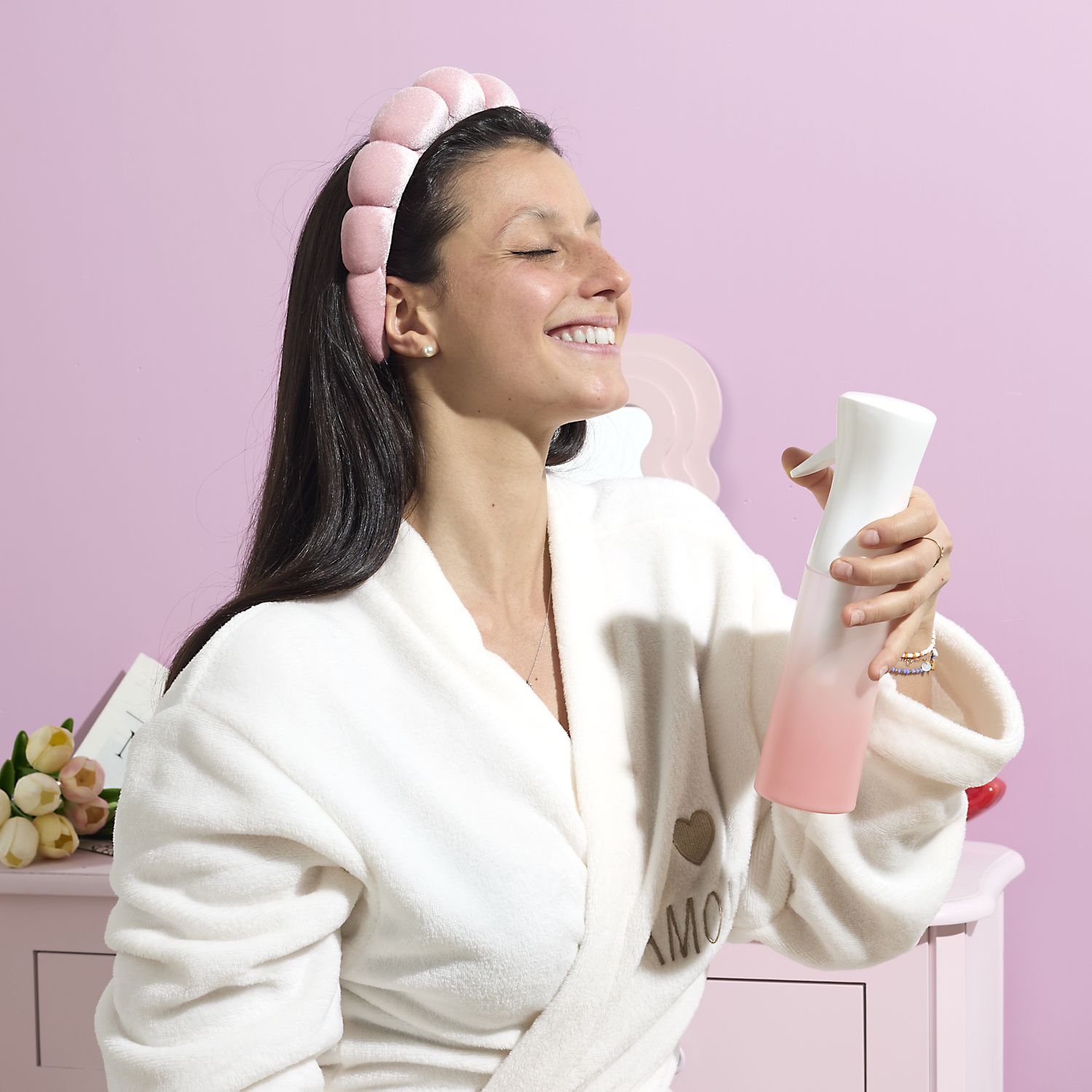 Le serre-tête n’est pas un simple accessoire, c’est une véritable déclaration d’élégance au service de votre routine beauté. Il maintient vos cheveux avec douceur, sans les abîmer, et vous permet de vous concentrer sur vos soins sans avoir à repousser une mèche rebelle toutes les trente secondes. Le brumisateur, quant à lui, délivre une brume fine et agréable, idéale pour hydrater la peau, fixer le maquillage ou simplement offrir un moment de fraîcheur en plein été. Ensemble, ils transforment les gestes du quotidien en véritables instants de détente, comme une petite parenthèse de spa à la maison.
